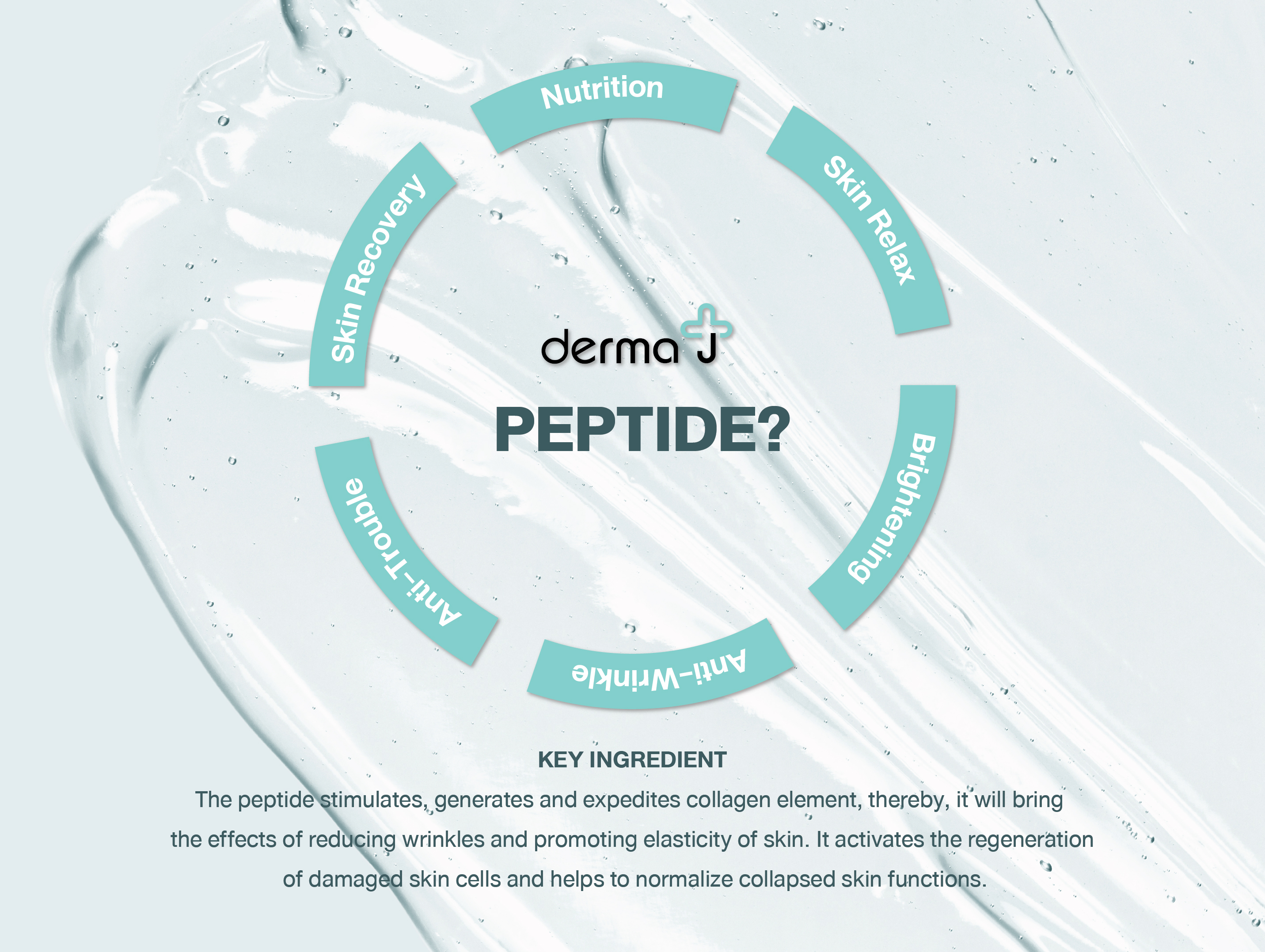 เปปไทด์ คือ กรดอะมิโนซึ่งเป็นส่วนประกอบของโปรตีน เปปไทด์มีอยู่ตามธรรมชาติในร่างกาย และเป็นสารที่จำเป็นต่อผิว โดยเฉพาะชั้นคอลลาเจนในผิวหนังประกอบด้วยเปปไทด์หลายชนิด เมื่อร่างกายมีอายุมากขึ้น การผลิตคอลลาเจนตามธรรมชาติจะลดน้อยลง การใช้ผลิตภัณฑ์บำรุงผิวที่มีเปปไทด์ที่มีคุณภาพสูงอย่างสม่ำเสมอ จะมีส่วนช่วยกระตุ้นการผลิตคอลลาเจน ช่วยฟื้นฟูผิว ทำให้ผิวกระชับ และดูอ่อนเยาว์ ซึ่งเปปไทด์เป็นส่วนผสมที่มีในผลิตภัณฑ์ Derma J นอกจากนี้ เปปไทด์ยังมีส่วนช่วยผิวพรรณในเรื่องอื่นๆ เช่น